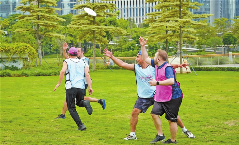 Chen Siqi vankochensq@163.com A GENTLE breeze and warm sunlight greeted a group of around 20 foreign sports enthusiasts, who gathered at Qianhai Guiwan Park on Saturday morning for an ultimate frisbee event. The event, themed “Undefined Frisbee: Fun Game for Expat Talent,” brought together seasoned frisbee players and newcomers brimming with curiosity about the sport. After receiving instructions from the coach on rules and throwing techniques — as well as several rounds of practice — all players gained a better grasp of the game and refined their throwing skills. The players were divided into two groups, sporting pink and blue vests, and competed eagerly on the grass. Seasoned players patiently instructed the newcomers, discussing strategy and providing them with opportunities to play. For Russian Nikita Potrashilin, it was his first time playing frisbee, and he thought that it is a very interesting sport. “There are rules and all that stuff that you need to learn,” Potrashilin said. He gave a thumbs-up to the coach and his teammates’ instructions, which allowed him to quickly understand how to play. Andres Raul Brown, from the U.S., is a seasoned player, who leads two frisbee teams that have participated in tournaments in Guangzhou, Thailand, Cambodia, and other places. “In Shenzhen, the frisbee community is growing, and we are trying to improve the spirit,” Brown said. He added that people who play frisbee are always in high spirits, which helps create a vibrant community. Before playing frisbee, expats attended an info session at the Qianhai International Talent Hub where they learned about Shenzhen’s sports venues and how to reserve them. Some participants shared their experiences in booking gyms, raised questions, and were provided actionable solutions at the gathering. Shenzhen now has 39,256 sports venues. Residents can make reservations for 10,230 of those venues through the “iShenzhen” app. Kisha Matthew, from the U.K., has been in Shenzhen for about eight months. She thought that the information shared was very helpful. Though she enjoys swimming, the high cost associated with fitness gym pools has been a barrier. Now, she can find more affordable swimming pools through the app. The event was hosted by the Shenzhen Municipal Science, Technology, and Innovation Bureau, organized by the Qianhai International Talent Hub and EyeShenzhen, and supported by the Shenzhen Municipal Culture, Media, Tourism, and Sports Bureau. |