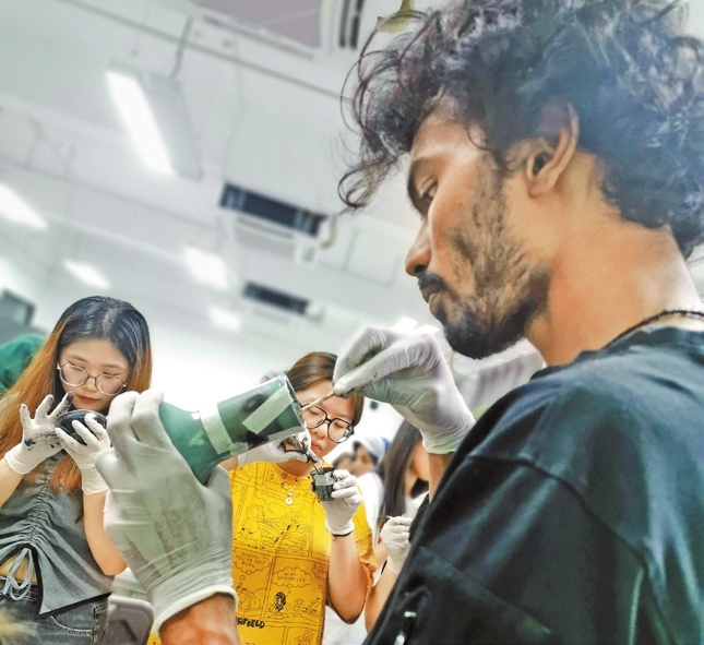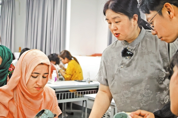 Debra Li debra_lidan@163.com MORE than 60 students have enrolled in an 18-session kintsugi art course at Shenzhen University (SZU), the first time that an intangible cultural heritage is systematically taught to college students, who will earn one credit upon completing the course and creating one piece of kintsugi work. The course, taught by Fang Ruihua, a fourth-generation inheritor of juci and kintsugi based in Bao’an District, is an innovative effort to enrich the school’s curriculum and disseminate Chinese cultural traditions. “In the past, people would repair stuff when they were worn or broken, but nowadays, most simply throw them away and get replacements,” Fang told a fully-packed classroom at SZU’s Canghai campus Sunday afternoon. “For me, the act of repairing items to extend their lifespan goes beyond just practicing sustainability; it teaches us about accepting life’s imperfections, appreciating each other’s uniqueness, and understanding the value of endurance.” Juci and kintsugi are both ancient Chinese ceramic restoration techniques employed to mend broken porcelain, pottery, and lacquer wares. While juci uses small metal staples to hold broken pieces together, kintsugi utilizes a special tree sap lacquer dusted with powdered gold, silver, or platinum as an adhesive to repair damaged items. Translating to “golden joinery” in Japanese, kintsugi is referred to in Chinese as “金繕” (pinyin: jīnshàn), meaning “repairing with gold.” The exact origin of kintsugi remains uncertain. A popular story alleges that some Japanese craftsmen developed the technique after shogun Ashikaga Yoshimasa in the late 15th century had his favorite Chinese tea bowl — which had been carelessly broken — repaired by juci in China and returned but disliked the visible metal staples. However, Fang suggests that like the tea ceremony and flower arranging, kintsugi has existed for centuries in China, but the Japanese refined these traditions as they became obsolete in their native land. This centuries-old practice is often used to mend cherished objects by enhancing the cracks, which serve as a visual testament to the object’s history. Once completed, beautiful seams of gold or silver glint in the conspicuous cracks of ceramic wares, giving a one-of-a-kind appearance to each repaired piece. Each attendee, many of whom were foreign students, received a small porcelain vase or bowl, which they then shattered into large pieces using a hammer. They meticulously applied adhesive to the edges of each piece before reassembling the item into its original shape. The adhesive — a blend of natural lacquer extracted from the sap of the lacquer tree and flour glue — is glossy, robust, and waterproof. In cases where small sections of the original ceramic are missing, a paste comprising the adhesive and clay powder is used to fill the gaps. “Working with the adhesive can be challenging due to specific requirements for it to harden, such as high humidity, and the lacquer itself can potentially cause skin irritation,” Fang explained. The students were instructed to take their items back to their dormitories, leaving them to dry in the bathroom while taking extra care to prevent contact with water. Teodora Lalovic, a student from Serbia studying Chinese at SZU, said the course was an enlightening experience. “Although I studied graphic design in my home country, I have never attempted this form of art before,” she said, adding that learning about Chinese culture and working with utensils will enhance her comprehension of 3-D models and inspire her future artistic pursuits. Sophomore student Liu Miaosi said she enjoyed the course. “Engaging in manual work provides a therapeutic experience, helping me focus on the present and alleviate all worries,” she said. “It feels as though I have time-traveled to my childhood, playing with my favorite toy.” Zhang Wenwen, a faculty member at SZU’s Media and Communication School, advocated for the integration of this course into the school’s curriculum. Leading a team of more than a dozen students dedicated to promoting cultural heritage, he expressed regret that certain traditions are better developed in other countries, with craftsmen from those regions revitalizing art forms like kintsugi. “Hopefully, this course will pique the interest of more young individuals in our cultural heritage,” Zhang said. |