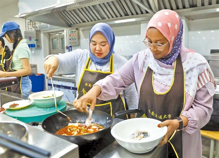 “IT’S scorching hot, but I absolutely love it,” said a Ph.D. student from Indonesia who introduced himself by his Chinese name He Sama. He savored a plate of fish fillets in hot chili oil that she had learned to make at a food education course at Southwest Jiaotong University in Chengdu, Sichuan Province, on June 19. She said it would be perfect if she had a bowl of rice to go with the fish dish. This class marked the last one of this semester for students in the course named Food Talks, where they can earn two academic points upon mastering the skills to prepare 12 classic dishes in Sichuan cuisine such as Mapo tofu and fried shredded pork with sweet and sour sauce. Standing beside He was another international student from Sudan, who was crafting a plate of cold-marinated rabbit meat, a specialty from Zigong City in Sichuan. “The marinated rabbit meat gains its zest from the chilli pepper and prickly ash seeds,” Liu Bo, the head chef with the university’s first student canteen, explained to the Sudanese student, who called herself Sima Yan. “I will definitely make the fish in hot chili oil dish for my parents when I return home for the summer vacation,” said a junior-year student from Russia who identified himself only as Max, concentrating on the fish dish in class. He said it was a challenging task to make the dish on his own. “I wrote down the whole procedure and took notes of the points that need extra attention during our teacher’s demonstration. But when I had my hands on the sliced fish, I had no idea where to start,” Max said. The Food Talks class has been the university’s the most sought-after elective course for two consecutive years, appealing to both Chinese and international students, disclosed Sun Yannan, director of Southwest Jiaotong University’s logistics and catering department. According to Sun, the lecturers and teaching assistants are all experienced chefs with the university’s canteens. They would usually arrive at the classroom one hour ahead of the class to have all the food ingredients, such as diced rabbit meats, ginger and garlic, ready. The teaching staff would also take the students to visit an off-campus vegetable-growing base and local wet markets to pick up ingredients needed for the class. “I did not know that the Food Talks would give me a hands-on experience on dish-making. When signing up for the course, I thought it was a gourmet appreciation class,” said Chen Shuheng, a design major student. She said she found it challenging but fun to do their own dishes, which she would definitely make for her parents once she got home. Yu Yangzhou, who was in charge of the Food Talks, said the course was designed to introduce China’s profound food culture and the history of Sichuan cuisine, familiarize students with the knowledge of various ingredients, and most importantly, enhance their hands-on ability and skills. He said they would divide up the students into two- or three-person groups to make sure that everybody has the chance to cook their own dish. The Food Talks class is among a number of newly designed courses that are introduced by the tertiary education institutions in China to enhance college students’ practical survival skills, like a tree-climbing class and the Life in the Wild class. (Claudia Wei) |