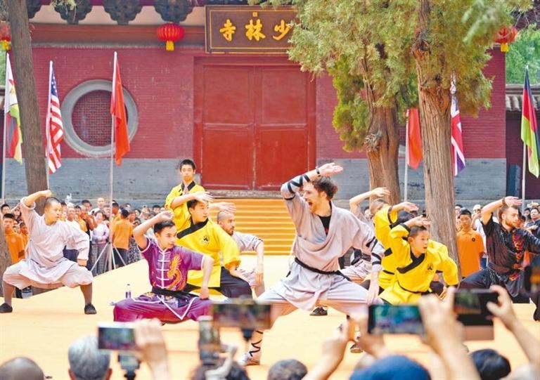 Shaolin kung fu practitioners perform at the closing ceremony of the 2024 Shaolin Games Finals at Shaolin Temple in Dengfeng, Henan Province, on Sunday. The contest saw 144 disciples from 47 countries gather at Shaolin Temple. The top 10 winners, who hailed from seven countries, earned the title of “Shaolin kung fu star” after the two-day competition. China News Service |