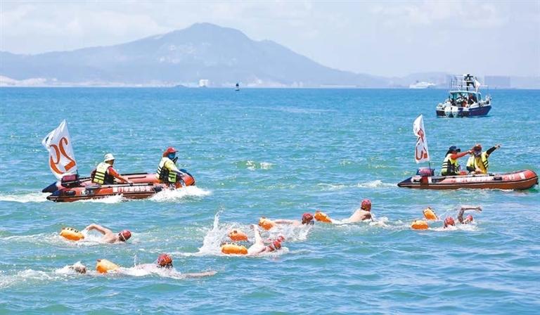 Participants swim at the 12th Xiamen-Jinmen Swimming Competition on Sunday. The two-person relay race from Jinmen to Xiamen attracted 200 competitors from both sides of the Taiwan Strait as well as Hong Kong and Macao regions.