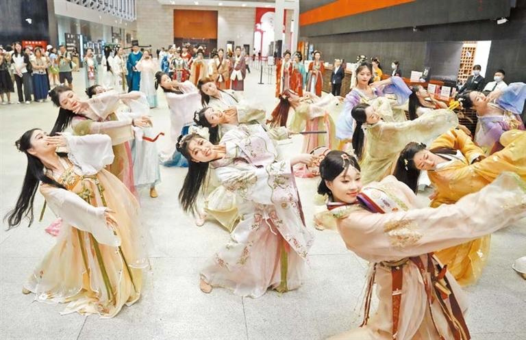 Dancers perform a flash mob dance at the Hunan Museum in Changsha, Hunan Province, on Sunday. The international academic symposium commemorating the 50th anniversary of the excavation of the Mawangdui Han Tombs was held in Changsha on Sunday. A series of events was held to mark the event, showcasing the inheritance and innovation of Han culture to the public and enhancing public awareness and interest in Han culture. China News Service |