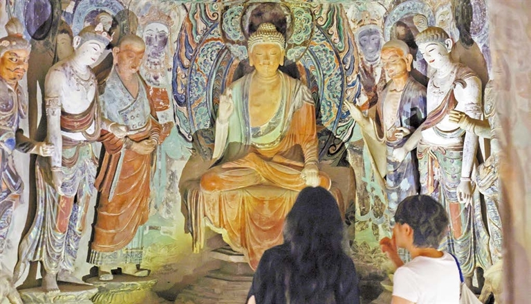 Two visitors admire the exhibits at a preview of “The Great Art of Dunhuang” exhibition, which kicks off at the China Art Museum in Shanghai on Friday. The exhibition, running until Dec. 20, features a wide array of rare artifacts from the collection of the Dunhuang Academy in Northwest China’s Gansu Province. China News Service |