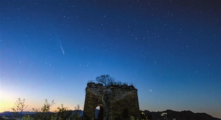 Comet Tsuchinshan-ATLAS is seen in the west sky above the Panlongshan (Coiling Dragon Mountain) section of the Great Wall on Saturday. The bright, icy space rock that’s traveled from the edge of the solar system is currently shining at magnitude +0.5, well within the grasp of the human eye. To see the comet from the northern hemisphere, look west from about 45 minutes after sunset; it’s just below and to the right of Arcturus, a bright red giant star in the constellation Bo?tes. The comet was first spotted in 2023 by the Purple Mountain Observatory of the Chinese Academy of Sciences and the Asteroid Terrestrial-impact Last Alert System (ATLAS). Xinhua |