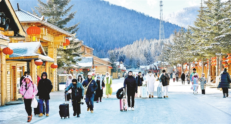 Tourists are seen walking yesterday in China’s Snow Town, a renowned tourist destination in Northeast China's Heilongjiang Province. Known for its distinctive winter landscapes, the site welcomed visitors with a plethora of cultural activities. A float parade, yangge dance performances, and a disco party in the snow were among the highlighted events.Xinhua