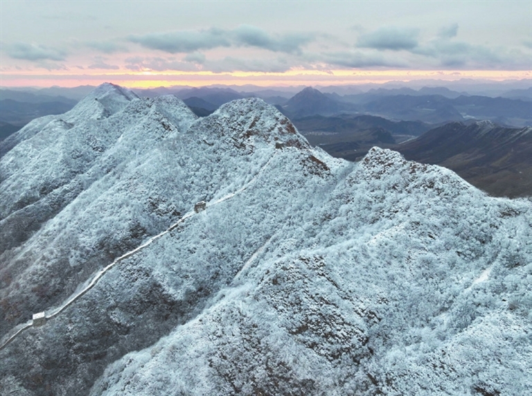 This aerial photo shows a snow-draped section of the Great Wall in Shangying Township, Hebei Province on Monday. Snowstorms and drastic temperature plunges are forecasted for various parts of China today and tomorrow, including Inner Mongolia, Heilongjiang, Jilin, and Shandong. Significant temperature drops are also expected in southern provinces. Xinhua |