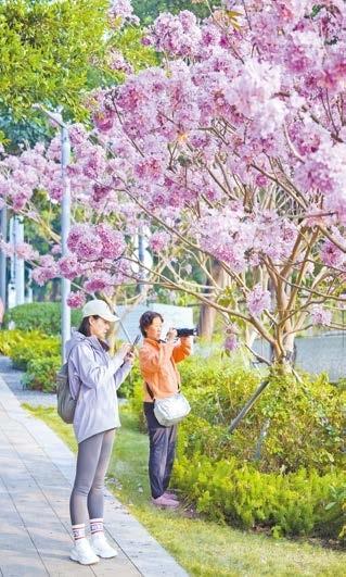 THE pink trumpet trees (Tabebuia rosea) are in full bloom at the Houhai Zhongxin River Park in Nanshan District, transforming the park into a vibrant sea of soft pink flowers. The picturesque sight, reminiscent of a dreamy anime scene, has become a must-visit spot for locals and tourists alike. The flower season for these trees runs from mid-December through March. During this time, the trees are covered with clusters of delicate pink flowers before their leaves begin to sprout. From a distance, the trees appear as puffy pink clouds, while up close, the flowers resemble small, hanging wind chimes, creating a serene and enchanting atmosphere. Located along both banks of the Zhongxin River in the park, approximately 100 pink trumpet trees are currently in full bloom. On sunny days, visitors flock to the park to capture the beauty of the trees with the perfect backdrop of blue skies, white clouds, and lush green grass. Whether you’re a photography enthusiast or simply looking to enjoy the tranquil surroundings, the park offers an idyllic setting for a day out. Photography tips: ● For the best lighting, it’s recommended to visit before 10 a.m. or after 3 p.m., when the sunlight is softer and more flattering. ● The park is primarily home to purple and pink trumpet trees. Wearing white or light-colored clothing will make your photos stand out and complement the soft tones of the flowers. ● For a creative touch, consider bringing props like books, magazines, picnic blankets, or newspapers to add a cozy, atmospheric feel to your photos. Venue: Houhai Zhongxin River Park, Nanshan District Metro: Line 2 to Wanxia Station, Exit A; then walk for about 16 minutes (Tang Li) |