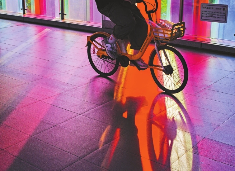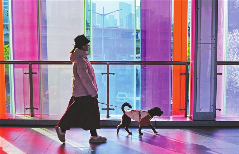 Recently, I encountered a footbridge adorned with multicolored glass panels on both sides. Arriving in the late afternoon as the sun was setting, I was greeted with a breathtaking scene — the sunlight filtering through the glass, creating vibrant shadows along the path. This enchanting footbridge is situated near the Shenzhen Convention and Exhibition Center in Futian District.