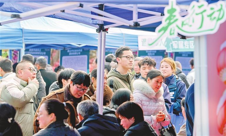 Job seekers are seen at a bustling job fair in Jiande, Zhejiang Province, on Thursday. This first job fair of the year 2025 in the city presented over 3,000 job opportunities from more than 120 companies. The organizers also offered comprehensive one-stop services, including skills training and consultations on labor policies. Xinhua |