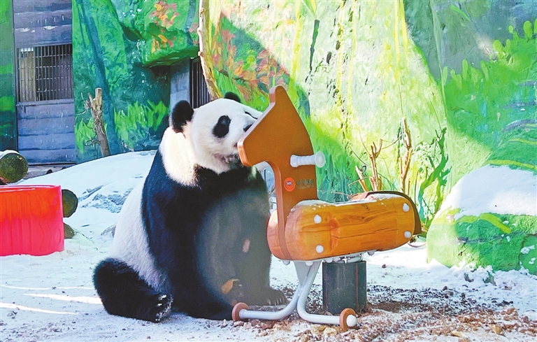 Katyusha, the first panda cub born in Russia in the summer of 2023, is curious towards her new wooden horse toy at the Moscow Zoo on Tuesday. Along with a chair, the toys were gifts from a Chinese firm and were presented to the adorable panda cub during a ceremony attended by zoo staff, visitors, and Chinese diplomats. China News Service |