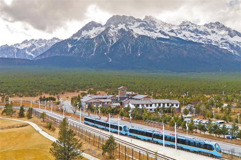 A sightseeing train is seen on its way to the majestic Jade Dragon Snow Mountain in Southwest China’s Yunnan Province on Tuesday. The new tourist train service, which began operations earlier this month, spans 20.46 kilometers and takes just 35 minutes to complete, with a designed maximum speed of 70 kilometers per hour. Connecting Lijiang Ancient Town to the Jade Dragon Snow Mountain, the train makes three stops at popular tourist destinations along the way. Passengers are treated to breathtaking views of snow-capped peaks, blooming flowers, and serene pastoral landscapes throughout the journey. Xinhua |