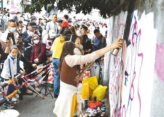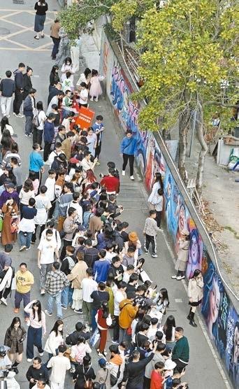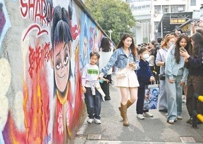 The wall, conveniently located on the street facing Exit A of Shangfen Station on Metro Line 6, has become a must-visit spot for photo opportunities, drawing in a steady stream of admirers.