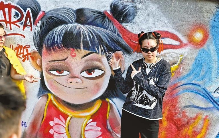 A COLOSSAL Ne Zha-themed graffiti mural, towering at 2 meters in height and sprawling 10 meters wide, has emerged on the wall of a community in Minzhi Subdistrict, Longhua District, capturing the attention of residents and visitors alike.