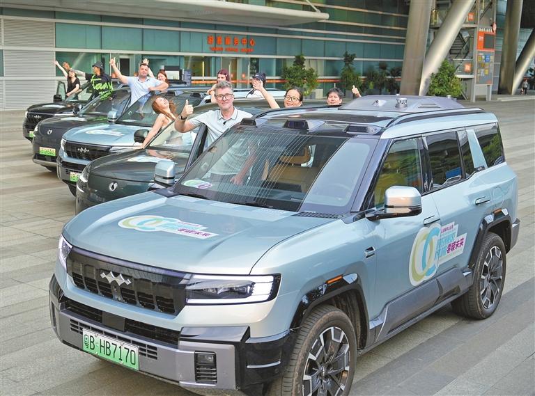International vloggers pose for a photo at Nanshan Energy Ecological Park in Nanshan District yesterday. Starting from BYD’s headquarters in Pingshan District yesterday, eight international vloggers from the U.K., India, Brazil, Russia, Egypt, Montenegro, Thailand, and Italy embarked on the Greenwise Xplore Road Trip to explore green technology in Shenzhen, Zhuhai, and Guangzhou. The group is on a journey that will last through Friday, traveling in two of BYD’s latest new energy vehicles — the Denza N9 and Fang Cheng Bao Bao 8. The vehicles are also equipped with the Lingyuan vehicle-mounted drone system. The event was co-organized by EyeShenzhen of the Shenzhen News Group in collaboration with the Publicity Department of the CPC Pingshan District Committee and BYD Co. Ltd. P3 > Lin Jianping |