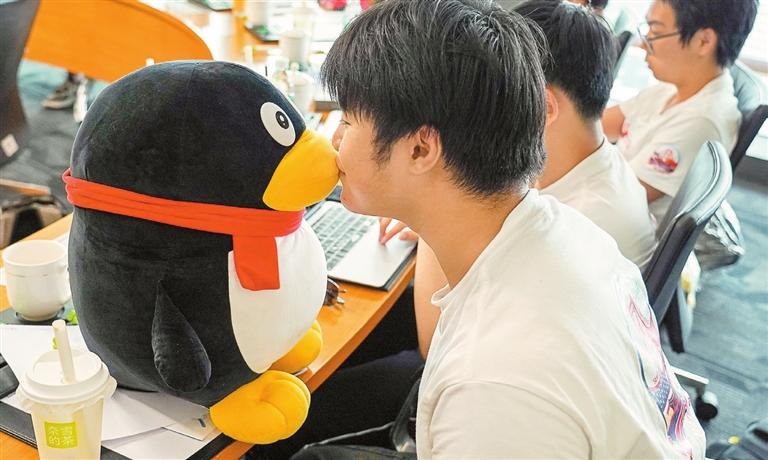 A visiting U.S. student kisses a penguin plushie during an AI workshop at Tencent’s global headquarters in the Buihai Building in Nanshan District yesterday. He was one of 22 students from U.S. universities touring the tech giant.