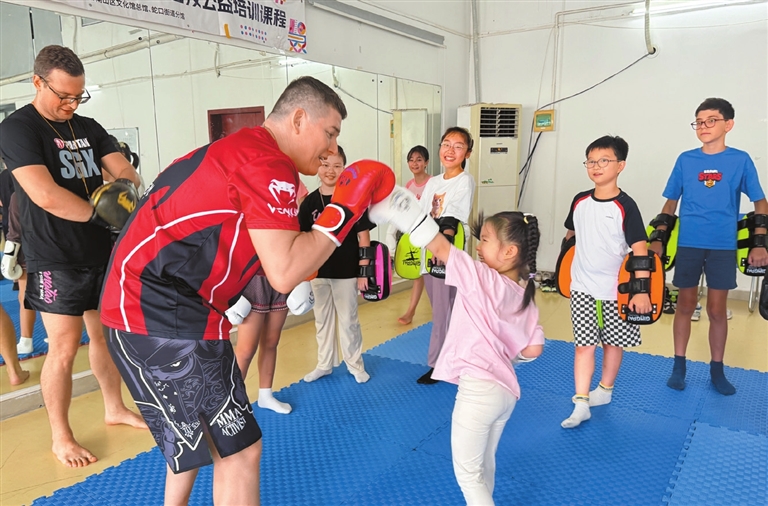 Wei Jie claudiamente@hotmail.com A SHEKOU gym was transformed into a boxing club yesterday morning when 22 local and expat children gathered for a two-hour Muay Thai session, which was led by SGX-certified coach Roman Dogushev and organized by the Shekou Management and Service Center for Expats (Shekou MSCE). Lining up in two rows, the children followed Dogushev and his assistant, coach Diego Oliveira, through a Muay Thai warm-up that included joint mobilization, hip and leg activation, stretching, and coordination drills to improve flexibility and reduce the risk of injury. In less than 20 minutes, the children bonded with one another while completing the coaches’ tasks. Carlos Gonzalez, from Mexico, was pleased to see his 6-year-old daughter Ana Paola join the fun. “This is exactly what I wanted to see — to make new friends while exercising,” said the father, who owns an IT service company in Shenzhen. The Gonzalez family lived in Shanghai for over 12 years before relocating to Shenzhen eight years ago. Ana, who now attends an international school in Nanshan District, speaks fluent Chinese, English, and Spanish. “We brought her to Shenzhen when she was just 2 months old, and she has grown up here,” said Gonzalez, expressing his gratitude to the Shekou MSCE for organizing the event. When the training session progressed to sparring, the kids’ excitement was palpable. Split into pairs, they put on Muay Thai gloves and focus mitts, following the guidance of Dogushev and Oliveira to practice offense and defense. Ouyang Lei, a local father who brought his 5-year-old son to the event, praised the organization of the training session. He appreciated that parents were required to wait out of sight of the training session. “I was a little nervous at first. But I soon realized the benefit of parents not being present, as they can sometimes be overly protective,” he said. Staff from the Shekou MSCE posted real-time short videos of the training in the WeChat group for the Muay Thai session to keep parents informed. The Thai boxing event was part of a series of summer vacation activities organized by the Shekou MSCE to enrich the holiday experiences of local and expat children. “Children are often glued to screens during the holidays. We wanted to change that,” said a staff member from the Shekou MSCE. Two weeks ago, the Little Spartan adventure camp was held, attracting approximately 30 children from around the world. They transformed into Spartan warriors to tackle strength drills and teamwork challenges, pushing their limits under the guidance of Dogushev and Caroline Pei. The summer activity series also included a painting workshop led by Portuguese artist Majó. The workshop, originally scheduled for July 20, was moved to yesterday afternoon due to Typhoon Wipha. |