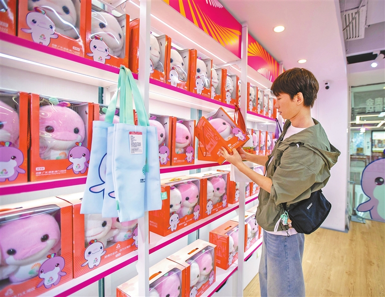 A shopper examines a mascot toy at an official merchandise store in Shenzhen Book City, Futian District, which sells products for the upcoming 15th National Games, the 12th National Games for Persons With Disabilities, and the 9th National Special Olympic Games. The 15th National Games will take place from Nov. 9 to 21 in 19 cities across the Guangdong-Hong Kong-Macao Greater Bay Area. The mascots, named “Xiyangyang” and “Lerongrong,” symbolize joy, harmony, and unity. They are inspired by the Chinese white dolphin, a nationally protected species. The 100-day countdown to the main games begins this Friday. |