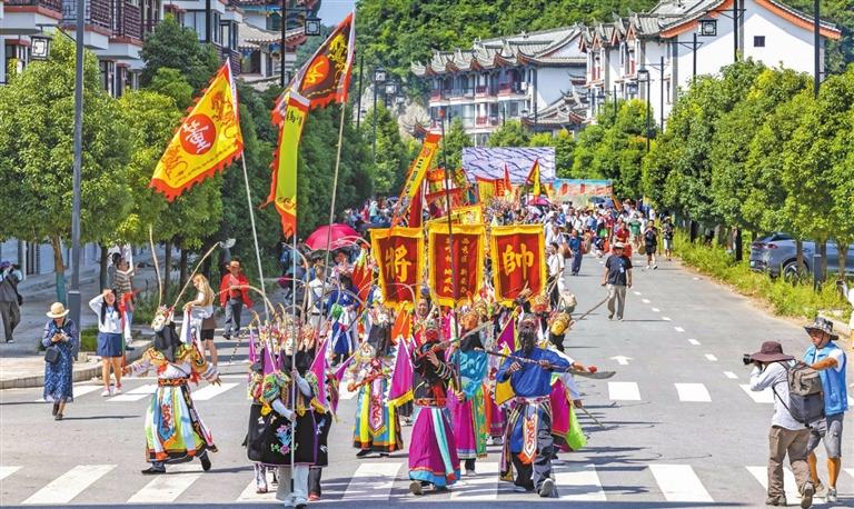 A CARNIVAL featuring Anshun Dixi opera performances began Saturday at Miaoling Tunpu, a tourist destination in Anshun, Guizhou Province, aiming to inspire public enthusiasm for this treasured local cultural heritage. Hailed as the “l(fā)iving fossil of Chinese theatrical culture,” Anshun Dixi opera originated during the reign of Ming Dynasty’s first emperor, Zhu Yuanzhang, in the late 14th century. Zhu sent 300,000 soldiers from the north to quell rebellions in the south, and after the war, some troops and their families settled in Guizhou. These military settlements became known as Tunpu. Over time, Tunpu residents blended historical tales with military drills into Dixi opera, a unique theatrical art form celebrating their loyalty and bravery. In 2006, it was listed among China’s first national intangible cultural heritage items. Today, local troupes perform across China and abroad, including in France and Romania. The opening ceremony showcased not only traditional Dixi opera but also local rappers performing dialect-infused songs inspired by the ancient art. The event features 10 performance zones, where 100 Dixi troupes will compete. A grand parade will see costumed performers march through the scenic area to the beat of war drums and battle songs, recreating the spectacle of soldiers heading to war. Meanwhile, social media influencers will join a Dixi-inspired fashion show. Visitors can also enjoy costume experiences, Tunpu delicacies, and an exhibition that displays Dixi opera masks, librettos, and other items detailing the evolution of this art form. This selection of photos gives our readers a glimpse into this vibrant carnival.(SD News) |