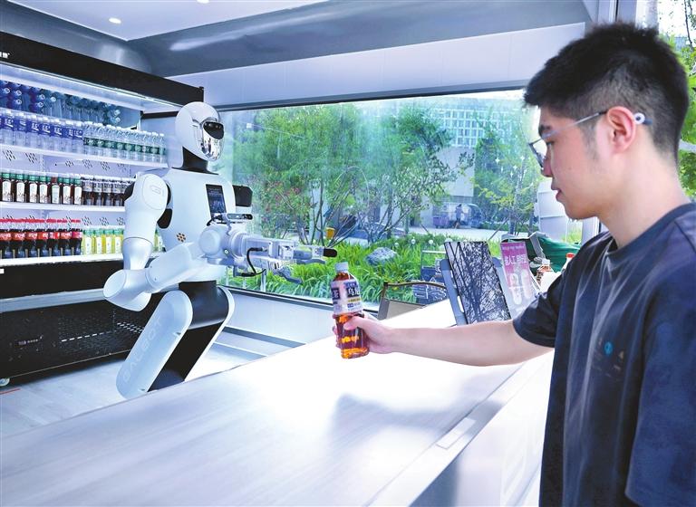 ? The Galbot, a humanoid robot developed by Beijing Galbot Co. Ltd., delivers a bottled drink to a customer at an all?robot store in Art Park, Beijing, yesterday. The outlet, which opened Thursday, is operated autonomously by Galbot. The robot can interact by voice, process orders and payments, grasp items precisely, and deliver products. Each store occupies just 9 square meters and runs around the clock without human staff, offering beverages, snacks, cultural and creative goods, and medicines.China News Service |