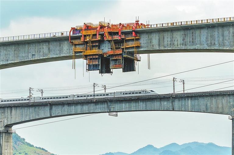 This aerial photo taken Sunday shows the construction site of the Caijiagou double?track super bridge on the Chongqing–Wanzhou high?speed railway. Built by China Railway Construction Bridge Engineering Bureau for the new Chongqing–Wanzhou line (Yuwan HSR), the bridge has successfully closed its main span, paving the way for the line to open on schedule. Located in Fuling District, Chongqing, the Caijiagou bridge spans a tributary of the Yangtze River and is one of the project’s most challenging structures, with a total span of 584 meters. The Yuwan HSR is part of China’s “eight vertical and eight horizontal” high?speed rail network; the main line is 251 kilometers long and designed for speeds of up to 350 km/h. Xinhua |