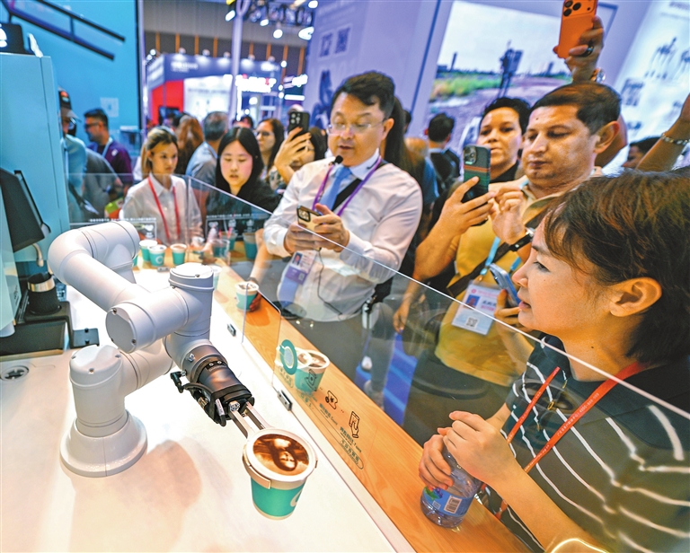 Visitors watch a coffee?making robotic arm at Shenzhen?based DH?Robotics’ booth during the 138th Canton Fair in Guangzhou on Thursday. More than 1,370 Shenzhen-based companies are taking part in the fair, occupying over 3,000 booths. On the fair’s opening day Wednesday, Shenzhen exhibitors closed deals worth US$115 million, four times the amount recorded on the first day of last autumn’s fair, the city’s commerce bureau said. The fair will run through Nov. 4. P3>Xinhua |
