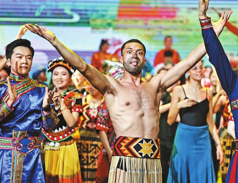 ? Chinese and international performers take a bow after rehearsing before the opening of a touring production of the 13th China International Folk Arts Festival at the Xixiang Auditorium in Bao’an District, Shenzhen, last night. The festival, launched last week in Foshan, features troupes from 13 countries across five continents, with performances scheduled in Shenzhen, Zhuhai, and Dongguan. Established in 1990, this large-scale cultural exchange is held every three years.Liu Xudong |