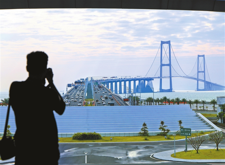 A visitor photographs the Shenzhong (Shenzhen-Zhongshan) Bridge, a key part of the Shenzhong Link, from the viewing platform on the link’s West Artificial Island, which opened for trial tourism operations Saturday. Covering 137,000 square meters — equivalent to 19 soccer fields — the island operates in trial mode until its official opening in December. During this period, group reservations are accepted on weekdays, with weekend visits open to the general public. Tickets, priced 188 yuan (US$26.4 ) for adults, and reservations are available via the WeChat mini-programs “深愛票,” “深中跨市公交專線,” or “香山暢行.” Group bookings can be arranged through the WeChat official account “深文旅發展.” Xinhua |