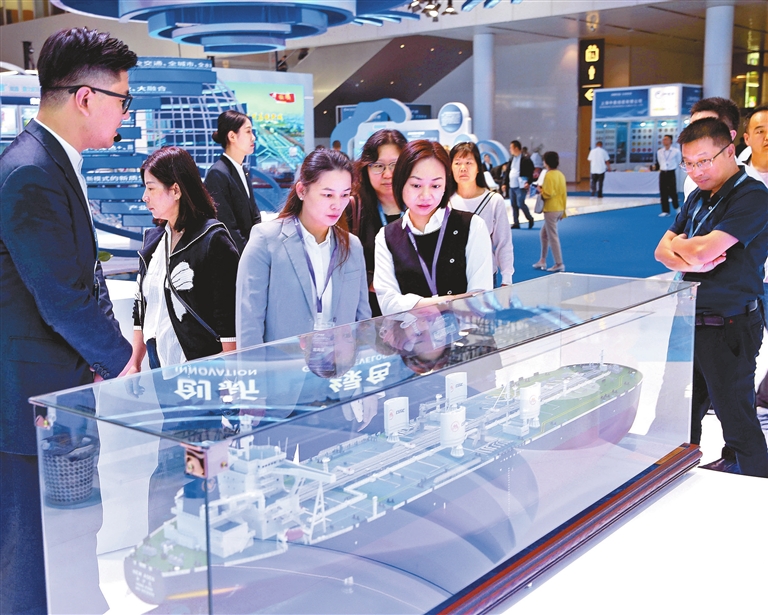 ? Visitors gather around a ship model at China Merchants Group’s booth during the 2025 China Marine Economy Expo, which opened at the Shenzhen World Exhibition & Convention Center in Bao’an District yesterday. The expo will last through Thursday. P3>Li Zhong |