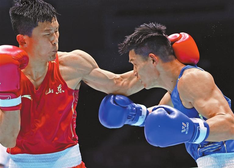 Boxers throw punches in the ring during the 15th National Games boxing finals at the Bao’an Sports Center in Bao’an District, Shenzhen, yesterday. The event, which will run through Nov. 14, marks the first time the district has hosted a competitive event of the Games. Over the 14-day tournament, 13 gold medals will be awarded across men’s and women’s divisions. The competition features a star-studded lineup including Paris Olympic champions Chang Yuan, Wu Yu, and Li Qian, alongside multiple world champions and Asian Games gold medalists. Metro: Line 1 to Bao’an Stadium Station (寶體站), Exit A/D.Liu Xudong |