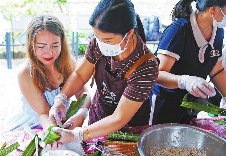 Chen Siqi vankochensq@163.com SEA urchin meat, hidden within a black, thorny, round shell, is often served as a delicacy with fried rice. But have you ever tried a zongzi filled with sea urchin? During Shenzhen International Marine Week 2025, a “Taste the Ocean” series event held at Dapeng Fortress on Saturday and Sunday gave expats and local residents the chance to taste this special dish and learn how to make it. Around 200 participants took part in the event. This unique delicacy is a form of intangible cultural heritage that originates from Nan’ao Village in Shenzhen’s Dapeng New Area. After listening to a historical overview of Dapeng Fortress — first built in 1394 during the Ming Dynasty (1368-1644) as a vital coastal defense stronghold and home to more than 10 military generals and their families — Tahiry Rakotomamonjy, a resident from Madagascar who has lived in Shenzhen for just five months, tried making the delicacy Saturday. “This is my first time hearing about zongzi. I will share this experience with my children,” said Rakotomamonjy. “It is very interesting to use what I thought were banana leaves to wrap food.” The leaves Rakotomamonjy mentioned were actually locally grown Mangye (芒葉), with the scientific name Thysanolaena latifolia. An instructor on-site, surnamed Zhong, explained that the leaves have a natural, faint scent that enhances the zongzi’s flavor. Unlike traditional triangular zongzi, sea urchin zongzi are usually rectangular. Zhong taught the participants how to wrap them: first, fold the leaves; then fill it with sea urchin, savory meat, peanuts, dried shrimp, and sticky rice; and finally, wrap it all up with a string. Zhong, who is also a Dapeng resident, told Shenzhen Daily that the best time to eat sea urchin zongzi is around the Dragon Boat Festival because the sea urchins harvested between May and July are the plumpest. “There is a saying — ‘Live off the mountain when you are on the mountain. Live off the sea when you are by the sea.’ As we live by the seaside, we are able to enjoy abundant seafood resources,” Zhong added. |