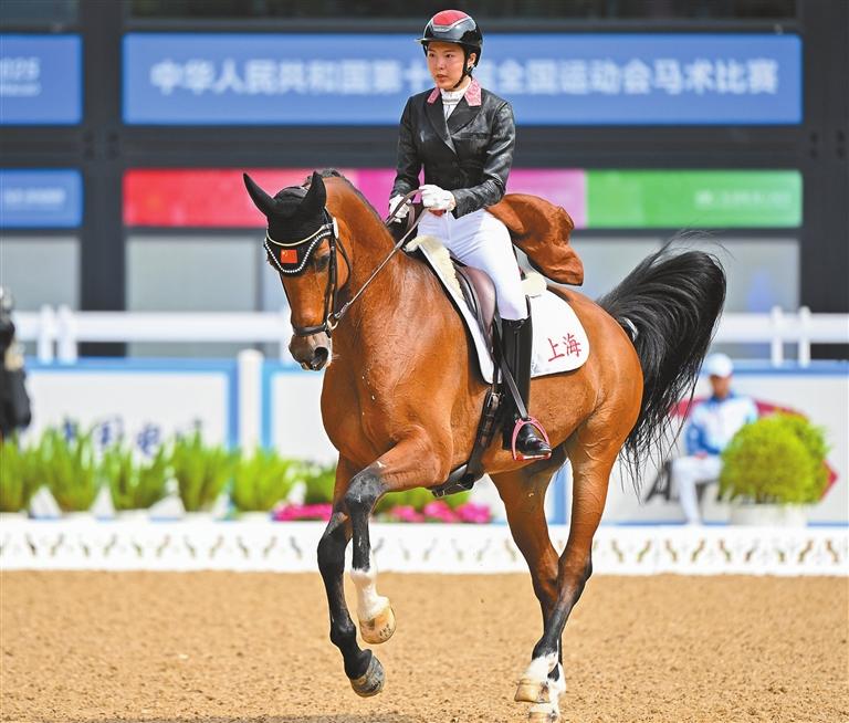Shanghai’s Wu Yue competes in the equestrian team dressage event of the 15th National Games at the Shenzhen Guangming International Equestrian Center yesterday. The Shanghai team clinched the gold medal in the event — the first gold medal awarded at a Shenzhen venue after the Games’ opening ceremony. P3>Courtesy of the Games organizers |