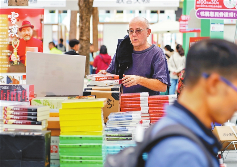 A visitor browses books at a booth during the ongoing 7th Shenzhen Book Fair at the Shenzhen Book City CBD Store in Futian District on Thursday. Over 600 leading publishers from home and abroad are presenting nearly 400,000 book titles and 60,000 cultural and creative products at the fair, offering content for all age groups and reading interests. The fair will run until Monday. P2>Lin Songtao |