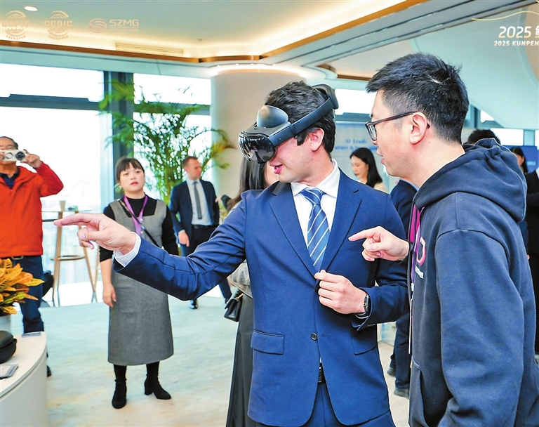 Sergio Games (C), from Mexico’s GAMEX Trading Co., tests a pair of AI glasses produced by a Shenzhen company during the 2025 Kunpeng · Autumn Gathering of the Shenzhen Global Business & Trade Networking Conference held at the Sky Museum in Futian District on Thursday. He was among more than 80 guests — diplomats from foreign consulates in Guangzhou and representatives from about 40 institutions and enterprises — who attended the event. P3> Courtesy of the Shenzhen Municipal Committee of the China Council for the Promotion of International Trade |