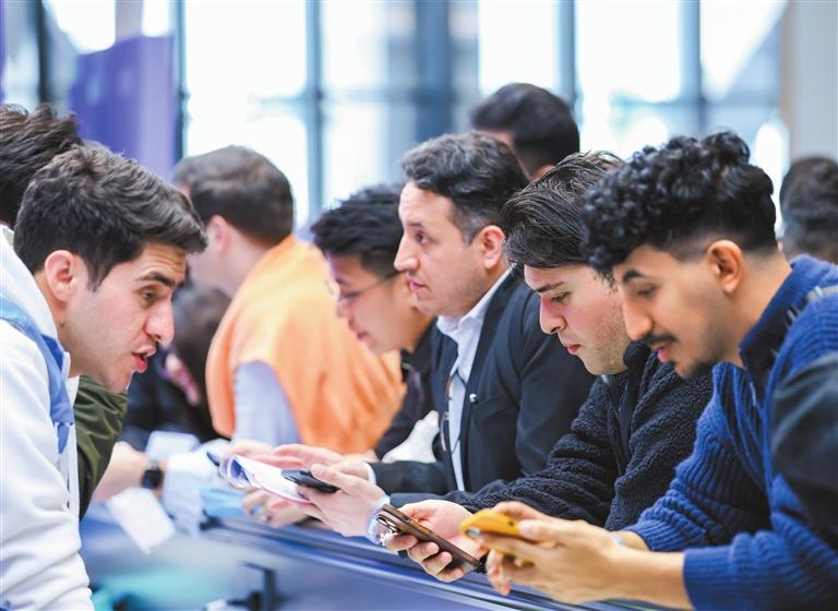 A volunteer (L) communicates with jobseekers at a recruitment fair for overseas talent at the International Business Talent Service Center on Saturday. The center, the first of its kind in the Guangdong-Hong Kong-Macao Greater Bay Area, officially opened at Qianhai Block V on the same day. P3> Courtesy of Qianhai Authority |
